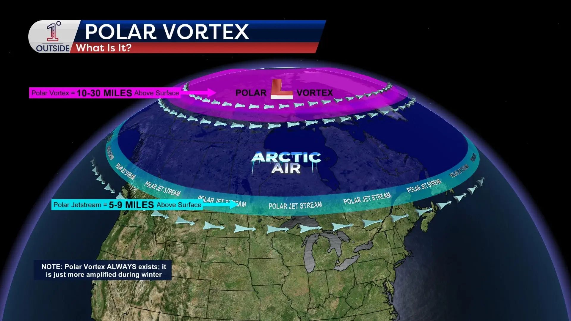 Polar vortex (below in pink): A large band of cold air that hovers 10 miles up in the atmosphere and encircles the North pole.
