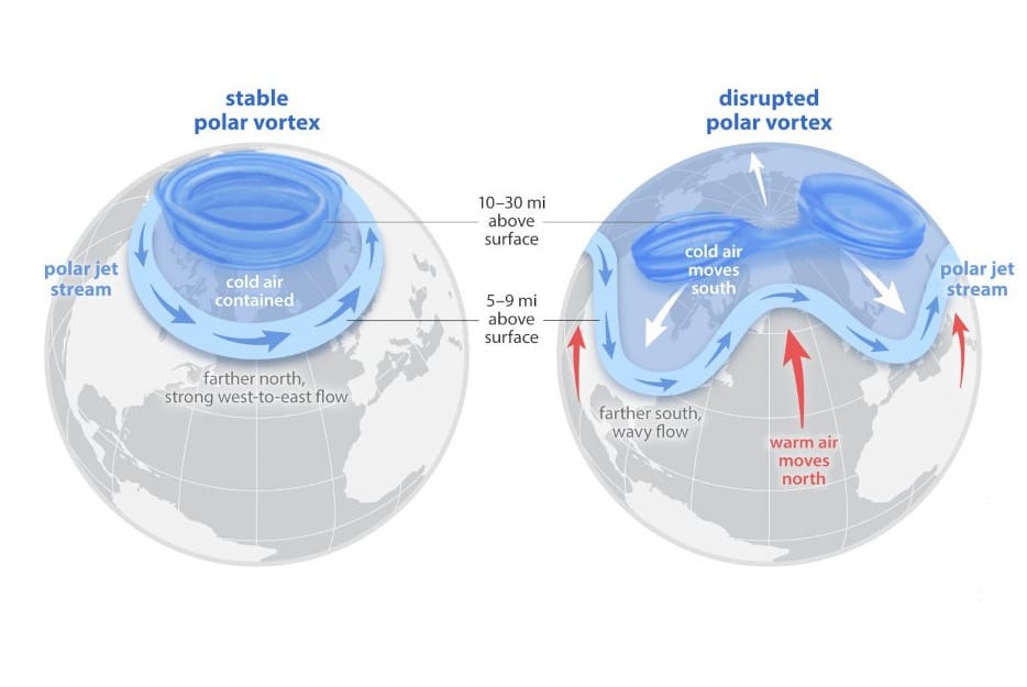 When the polar vortex is stable, the polar jet stream acts as a wall, keeping super cold weather from reaching lower latitudes. When the polar jet stream is weakened from outside influences, though, it can cause the jet stream to wobble and send uncharacteristically cold weather down to lower latitudes, and warmer air from mid-latitudes up toward the North pole.