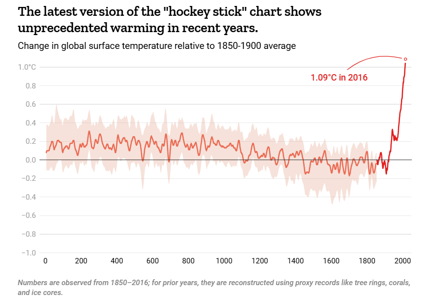 An updated version of the hockey stick graph that includes more recent temperatures (up to 2016) looks like this: